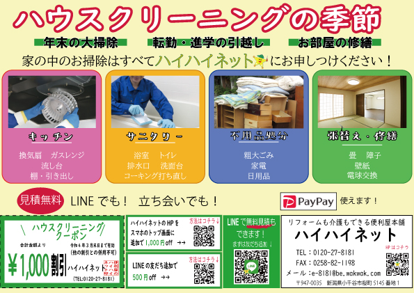お忙しい中、全部自分でやるのは大変!と思った方、↑画像のチラシをコピーしてクーポン券(令和4年3月末日まで有効)をすぐ用意。ハイハイネットにすぐご連絡ください!
