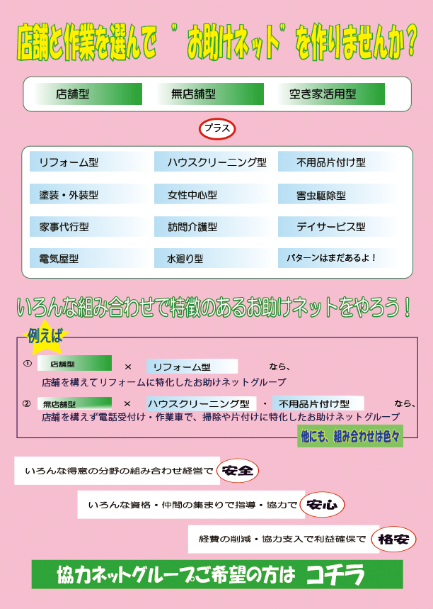 主にご自身の得意分野を生かしていただき、できない部分は協力仲間に依頼するなどのお困りごと解決方法で対応いたします。ご安心ください。チラシ配布のみの集客加盟店は車が無くても、歩いて配る事も出来ますのでシニアの方、女性の方でも出来ます。健康に良いお仕事です。